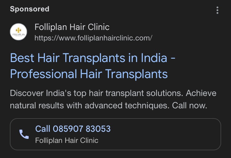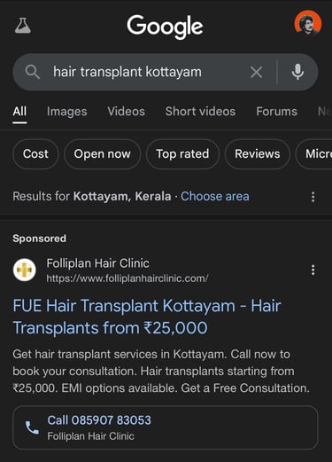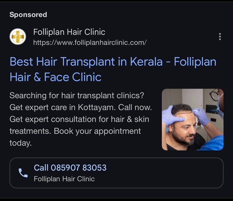 Created a performance-focused Google Ads strategy targeting keywords like hair transplant in Kottayam, PRP treatment, and beard transplant.