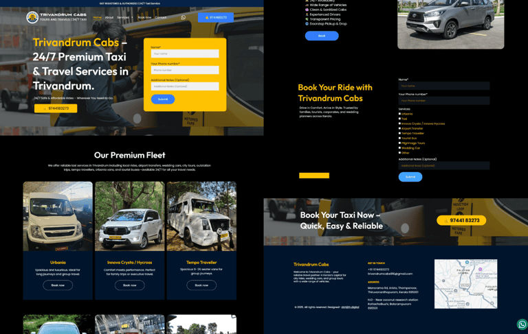 Built an SEO-optimized, mobile-friendly website designed to drive online cab bookings and improve user experience. Optimized their Google My Business profile for maximum local visibility and credibility. Launched high-converting Google Search Call Ads, consistently ranking in the Top 1 position on Google Search. Also achieved first-page rankings for multiple high-intent keywords related to taxi services in Trivandrum, resulting in increased bookings and inbound calls.
